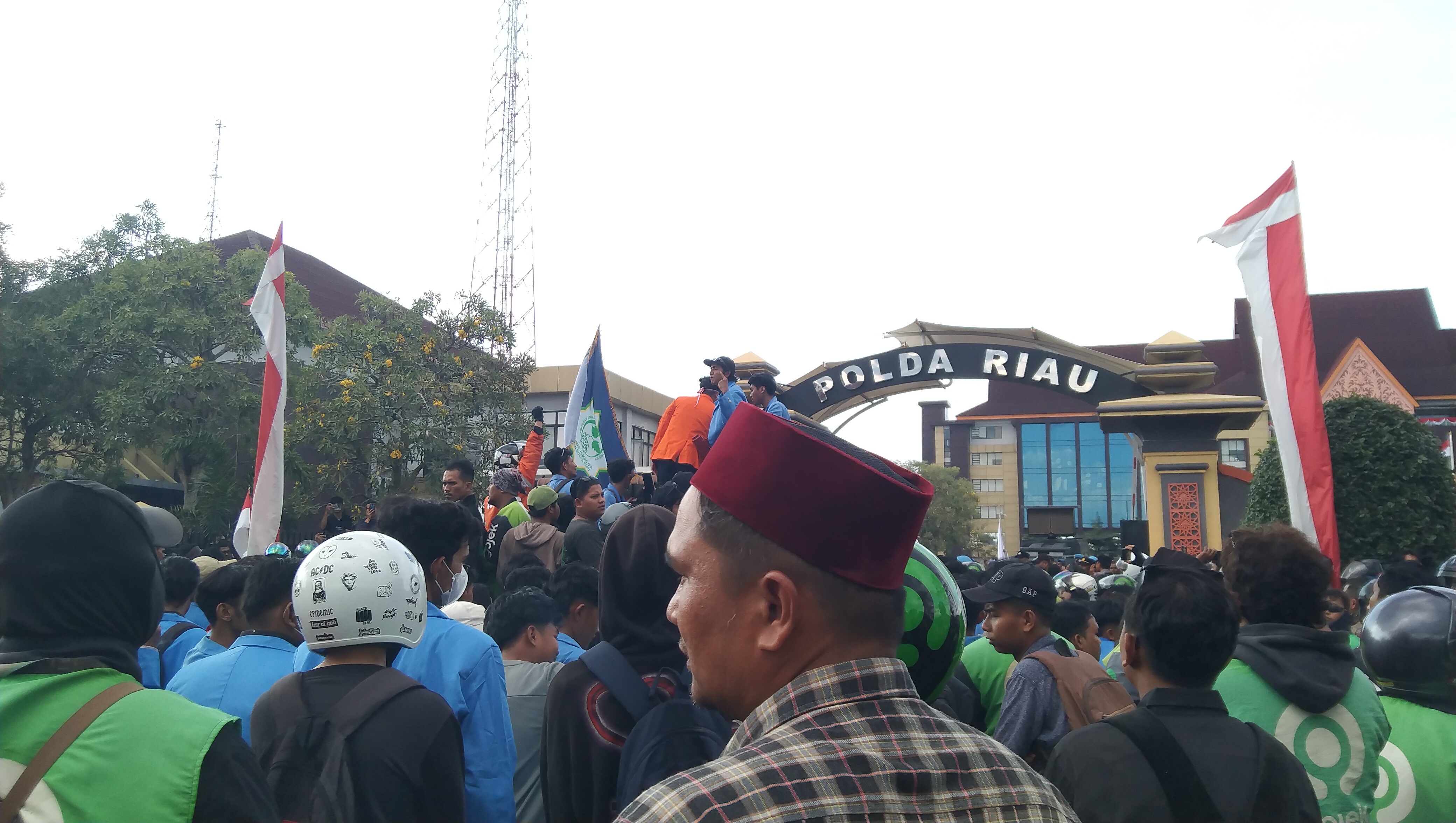 Dengan atribut jaket hijau khasnya, para pengemudi tampak memadati jalanan utama menuju Mapolda Riau. Sesampainya di depan gerbang Polda, mereka berkumpul seraya membentangkan spanduk bertuliskan “Keadilan Untuk Rekan Kami” serta meneriakkan yel-yel solidaritas.