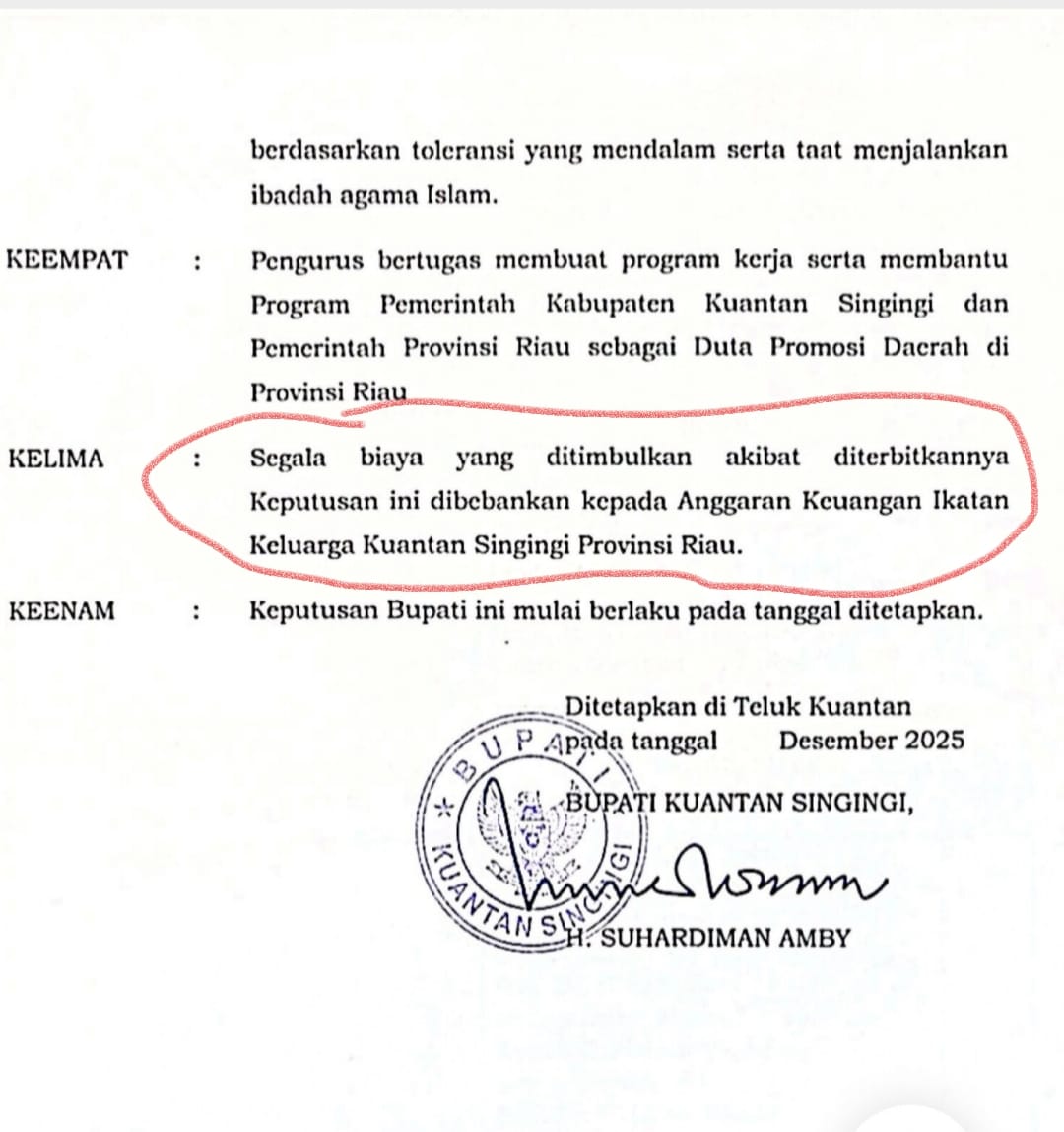 PEKANBARU, RIAUPRO.COM — Sebuah dokumen keputusan yang ditetapkan di Teluk Kuantan pada Desember 2025 menjadi sorotan setelah memuat ketentuan mengenai pembiayaan kegiatan organisasi Ikatan Keluarga Kuantan Singingi (IKKS) Provinsi Riau.