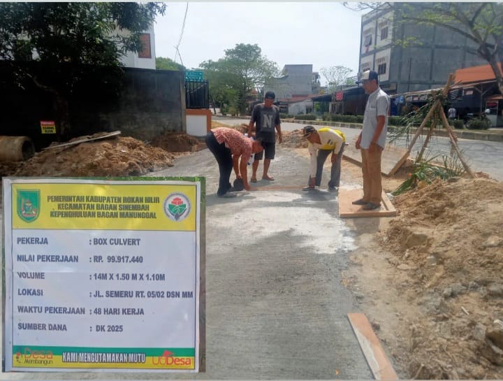 Rohil, Bagan Sinembah ll Pembagunan Box Coulverd bersumbet dari Dana Kepenghuluan tahun 2025 dengan pagu anggaran sebesar Rp 99.917.440 yang berlokasi di jalan Semeru RT 005/02 Kepenghuluan Bagan Manunggal telah selesai dikerjakan.