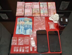 Saat kaleng dibuka di hadapan aparat desa dan saksi, ditemukan barang bukti yang cukup signifikan: 6 plastik bening berisi sabu-sabu (Total berat kotor 1,08 gram). Alat hisap (pipet rakitan). Plastik klip kosong & tisu pembungkus. 2 Unit Handphone dan Uang tunai senilai Rp 47.350.000 diduga hasil penjualan narkoba.