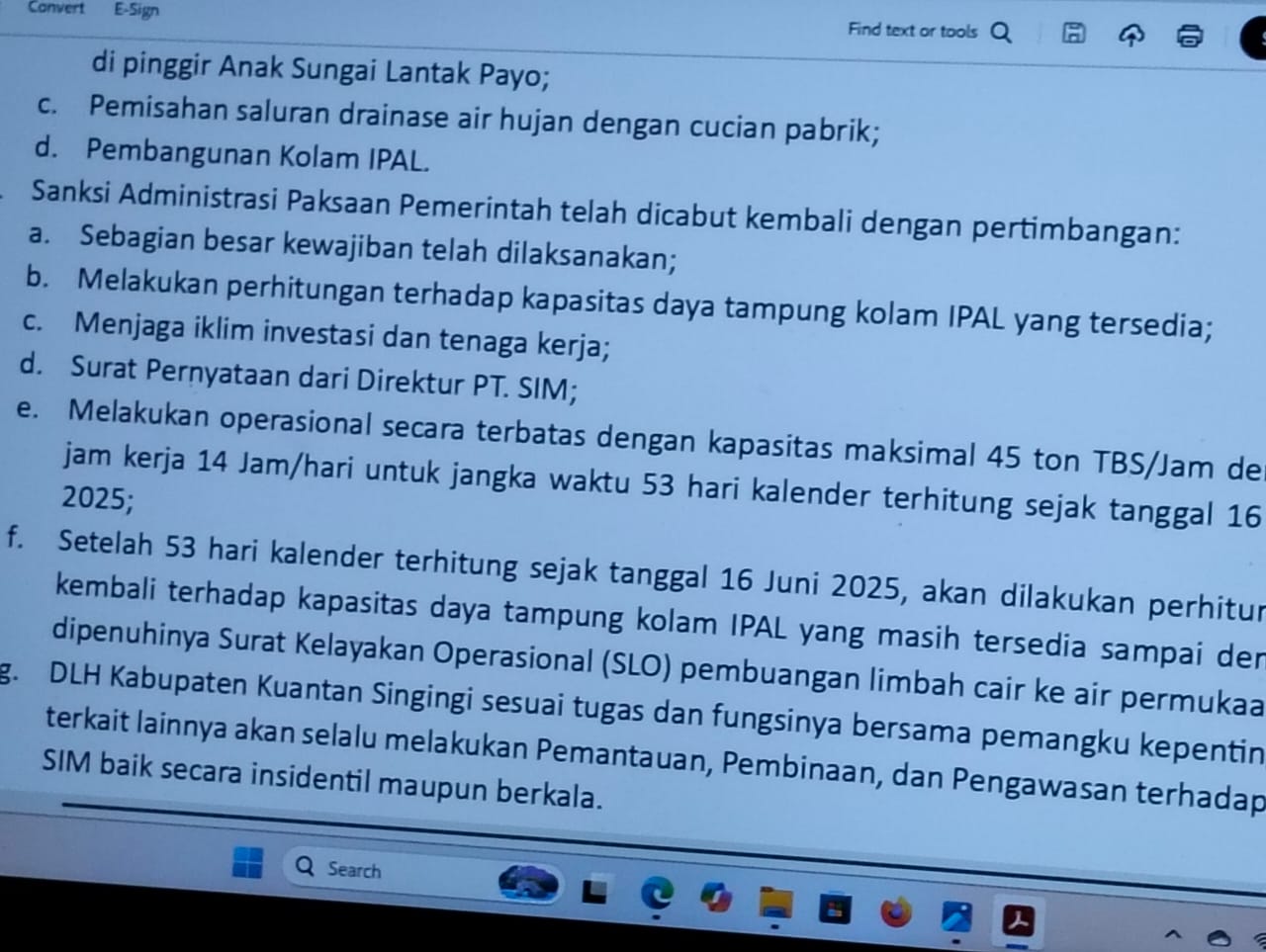 Berdasarkan Undang-Undang nomor 32 tahun 2009, PP 22 tahun 2021, dan Permen LHK nomor 14 tahun 2024, PT SIM telah memenuhi kewajibannya sebagaimana yang tertuang di dalam sanksi administrasi paksaan pemerintah.